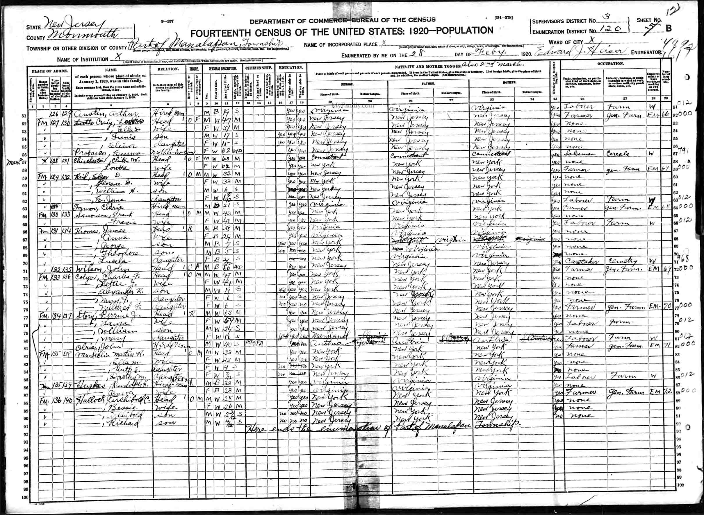 This file comes from a Census taken in 1920 in Monmouth New Jersey documenting Randolph Hughes.